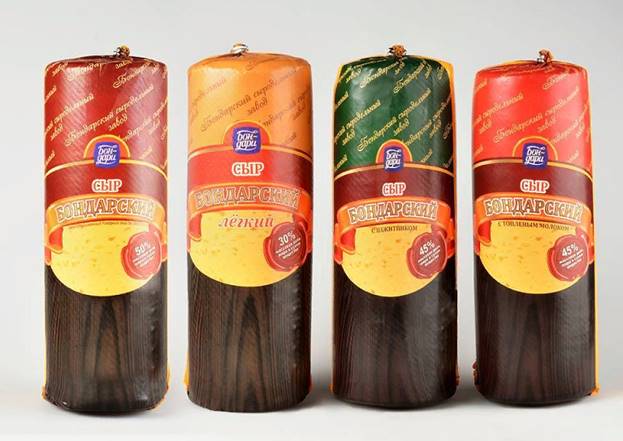 Эта разновидность сыра, по заверению производителя, может похвастаться выражено мягкими, а потому приятными вкусовыми качествами, в которых ощущается присутствие пряностей. Что касается его структуры, то он довольно лёгок, в меру упруг и при этом, обладает определённой пластичностью. На срезе любого куска можно наблюдать наличие глазков, их форма колеблется от круглой до слегка вытянутой. Бондарский поставляется потребителю в неком подобии колбасных батонов, ну или брусков, каждый из которых имеет протяжённость порядка трёх с половиной десятков сантиметров. В отношении свойственной ему жирности, заметим, что она находится в пределах от тридцати до пятидесяти процентов. Кроме того, стоит сказать, что Бондарский – это не один вид сыра, а, фактически, название целой линейки мягких сырных продуктов, в которой присутствует продукция весьма широкой вкусовой гаммы, есть даже сладковатый вариант, приготовленный с добавлением йогурта.